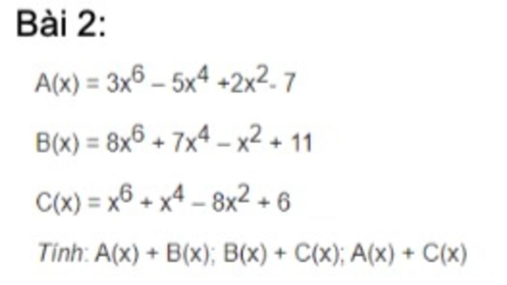 Vậy `A(x) + B(x) = 11x^6 + 2x^4 + x^2 +4`