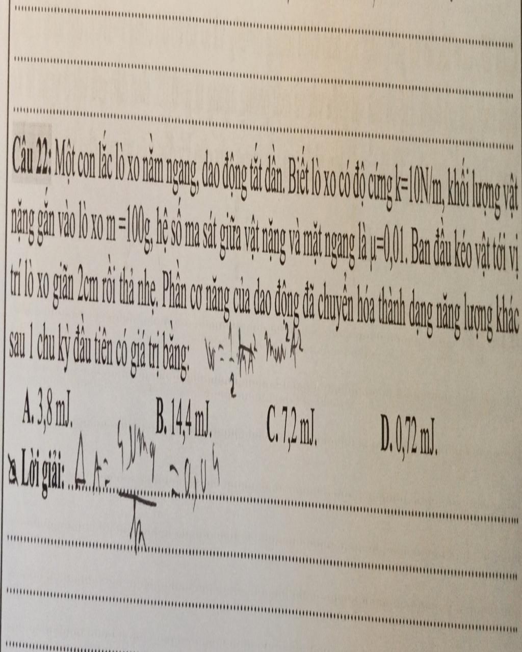 `E = 1/2 kA^2 - 1/2 kA''^2 = 1/2 . 10.0,02^2 - 1/2 .10.0,016^2 = 7,2.10^{-4} (J)= 7,2 (mJ)`.