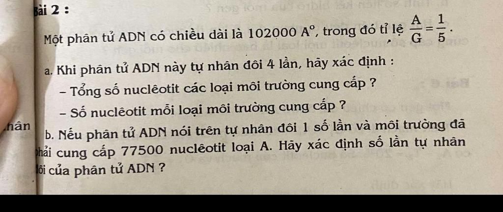 b) Phân tử DNA nói trên nhânh đôi k lần đã cần môi trường cung cấp 77500 nucleotide loại A.