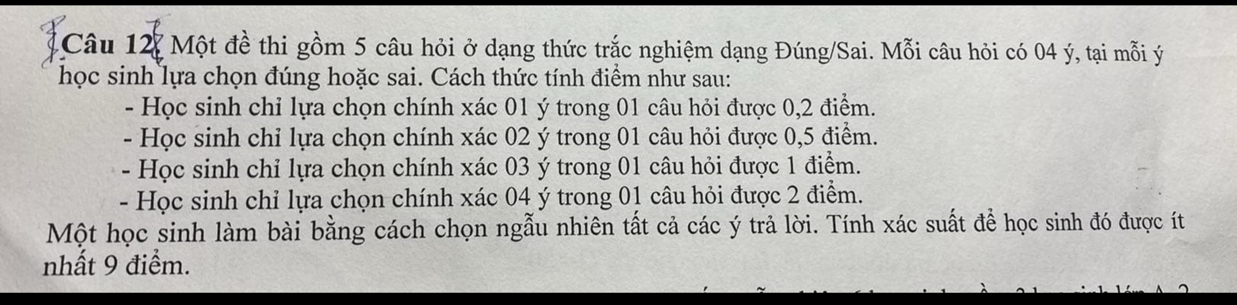 Xác suất để học sinh được ít nhất $9$ điểm là: