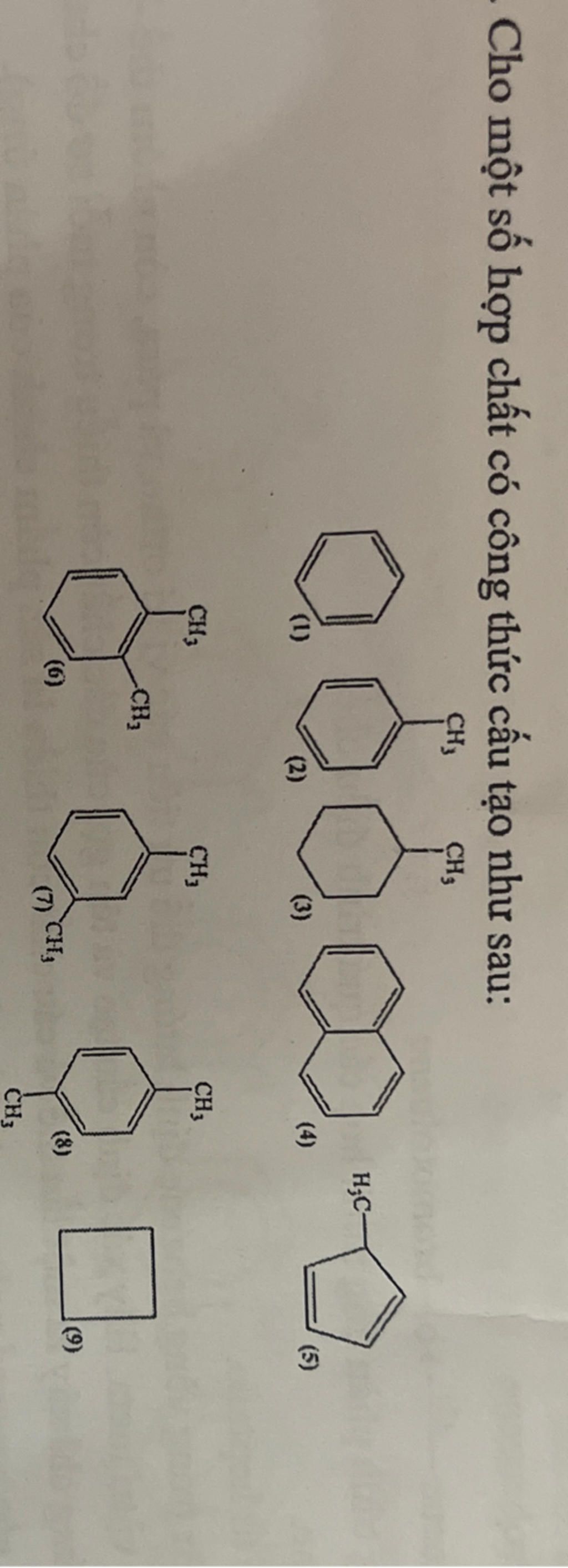 những hợp chất thuộc loại arene là: (`1`), (`2`), (`4`), (`6`), (`7`), (`8`)