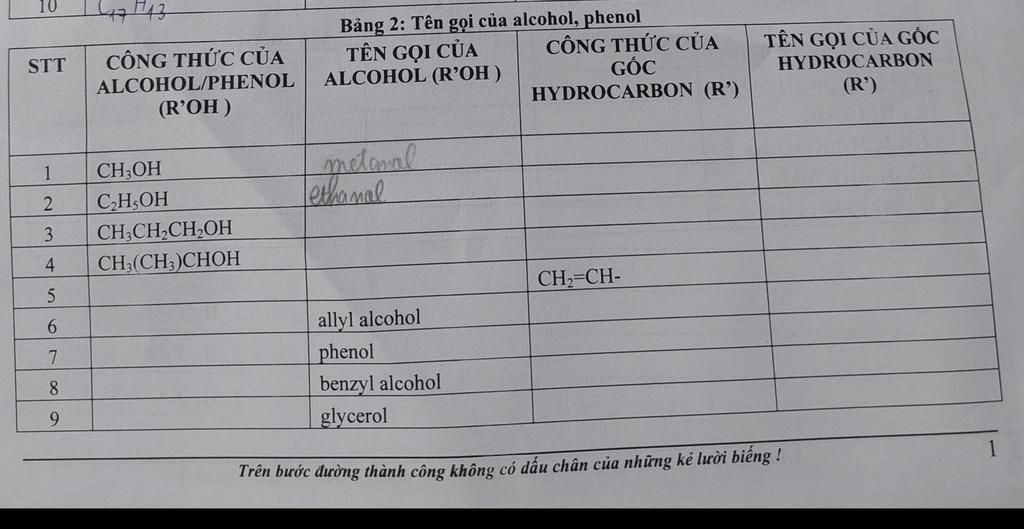 Bảng 2: Tên gọi của alcohol, phenol