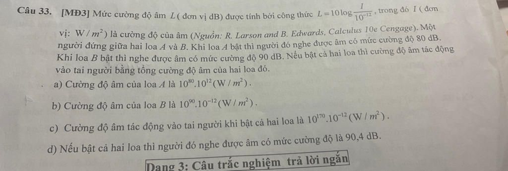 Câu 33. [MĐ3] Mức cường độ âm L ( đơn vị dB) được tính bởi công thức L=10log-