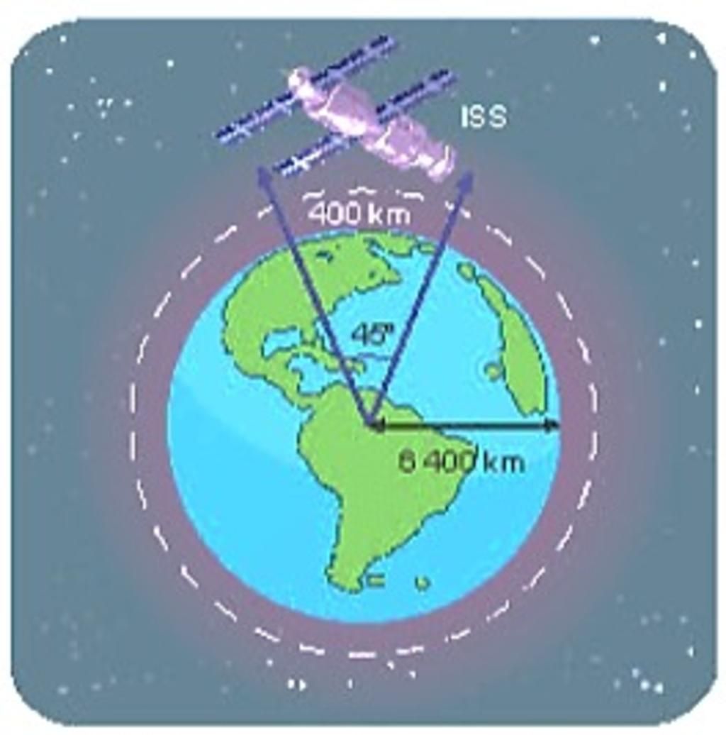Trạm vũ trụ Quốc tế ISS (tên Tiếng Anh: International Space Station) nằm trong quỹ đạo tròn cách bề mặt Trái Đất khoảng 400 km (H.1.1). Nếu trạm mặt đất theo dõi được trạm vũ trụ ISS khi nó nằm trong góc 45° ở tâm của quỹ đạo tròn này phía trên ăng-ten theo dõi, thì trạm vũ trụ ISS đã di chuyển được bao nhiêu kilômét trong khi nó đang được trạm mặt đất theo dõi? Giả sử rằng bán kính của Trái Đất là 6 400 km. Làm tròn kết quả đến hàng đơn vị.