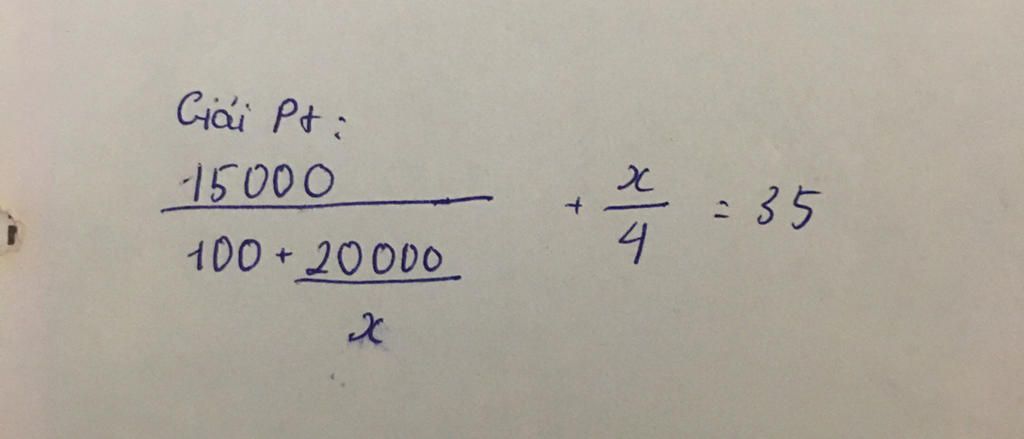 `15000/(100+20000/x) + x/4 = 35` ĐKXĐ: `x ne 0`