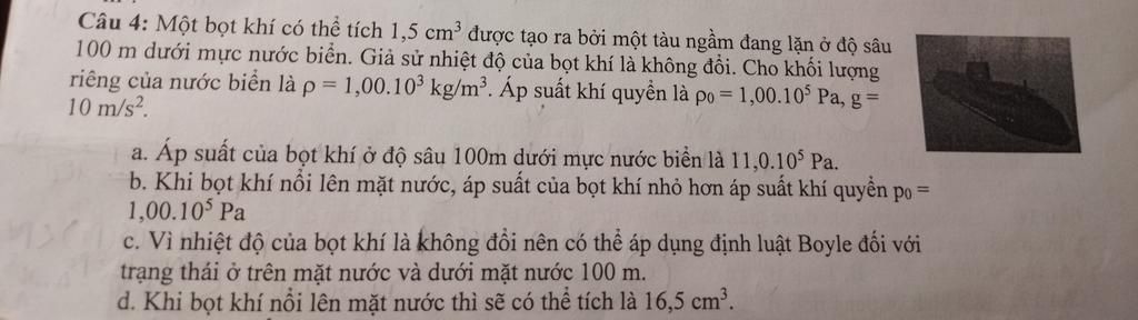 Vì nhiệt độ của bọt khí không đổi nên có thể áp dụng định luật Boile Marriott đối với trạng thái ở trên mặt nước và dưới mặt nước `100m`.