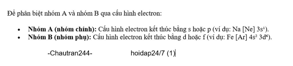 Cách nhận biết nguyên tố đó ở nhóm A hay nhóm B thông qua cấu hình electron