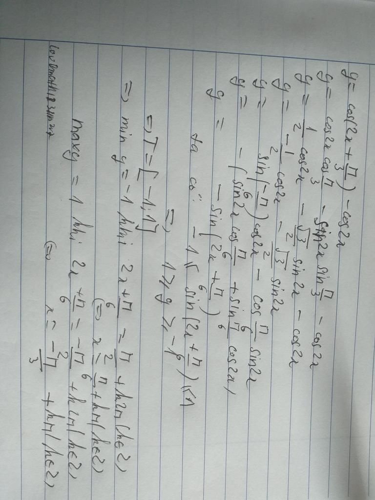 Tìm tập GIÁ TRỊ T và giá trị lớn nhất , nhỏ nhất của hàm số y = cos(2x + π/3) - cos2x( k chép mạng)