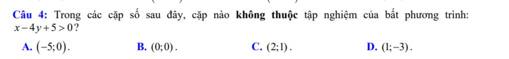 Trong các cặp số sau đây, cặp nào không thuộc tập nghiệm của bất phương trình: x-4y+5>0?