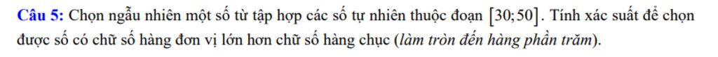 Ta có: `n(\Omega) = 50 - 30 + 1 = 21`