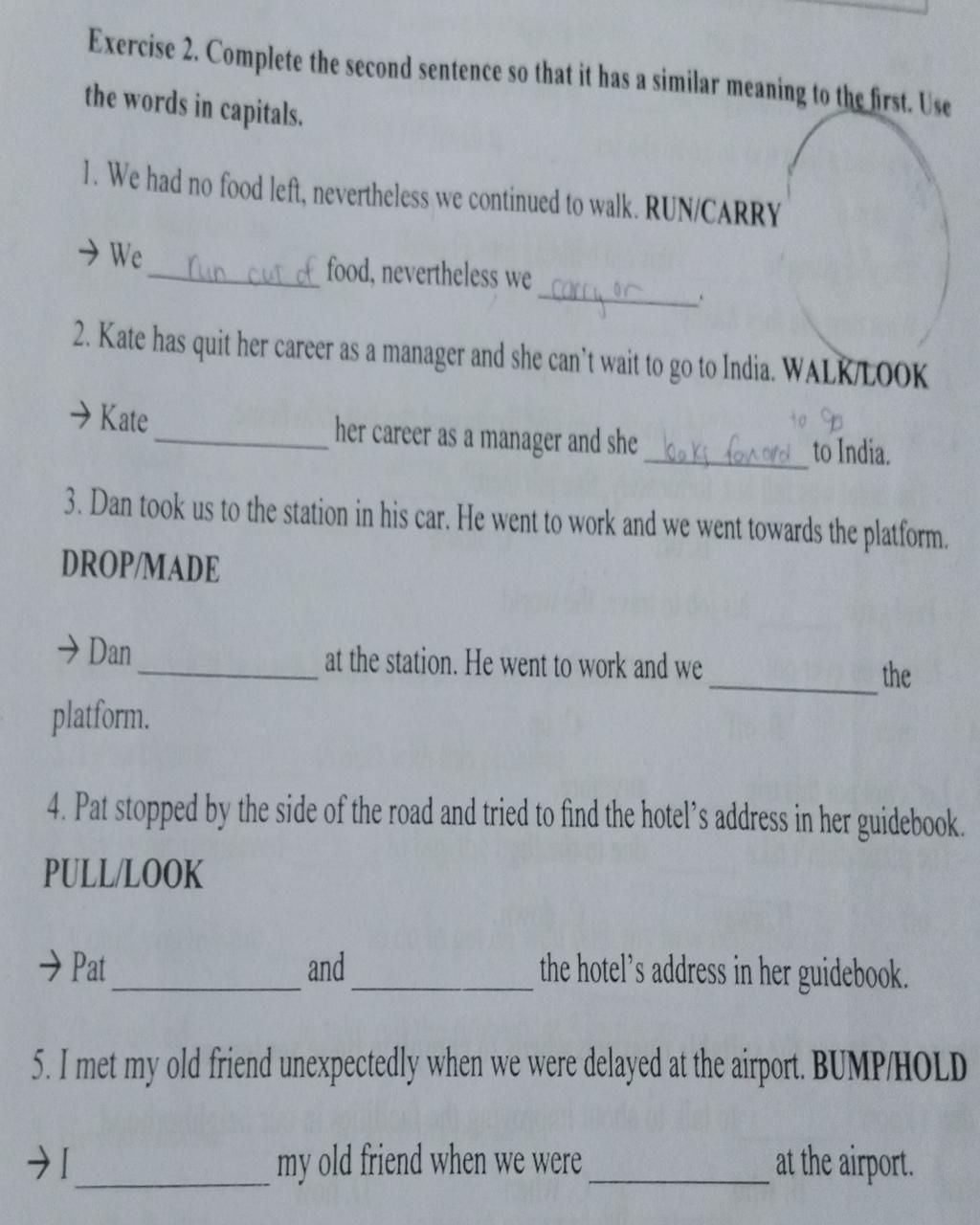 => "to run out of" = "to had no... left", "carry on" = "continued". (+ Ving, vì sau giới từ on)