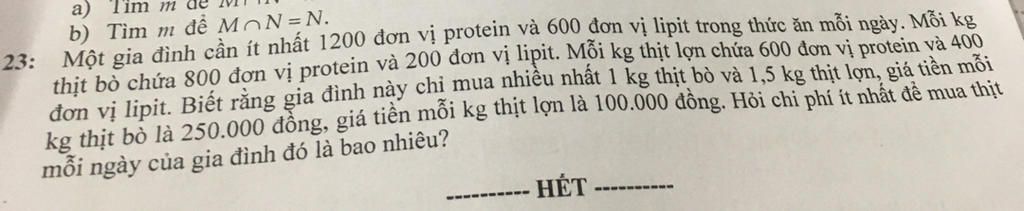 23: Một gia đình cần ít nhất 1200 đơn vị protein và 600 đơn vị lipit trong thức ăn mỗi ngày. Mỗi kg