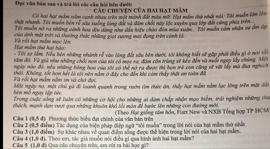 `->` Văn bản trên viết về câu chuyện giữa hai hạt mầm. Cả hai hạt mầm đều được gieo rắc gần nhau, nhưng hạt mầm thứ nhất lại dám vươn lên nghịch cảnh, có ước mơ được đâm chồi nảy lộc và lớn lên thật nhanh, và rồi hạt mầm mọc lên. Còn hạt mầm thứ hai lại nhút nhát, e dè không dám bén rễ sâu xuống mặt đất, và rồi chú đã bị một con gà nuốt chửng.