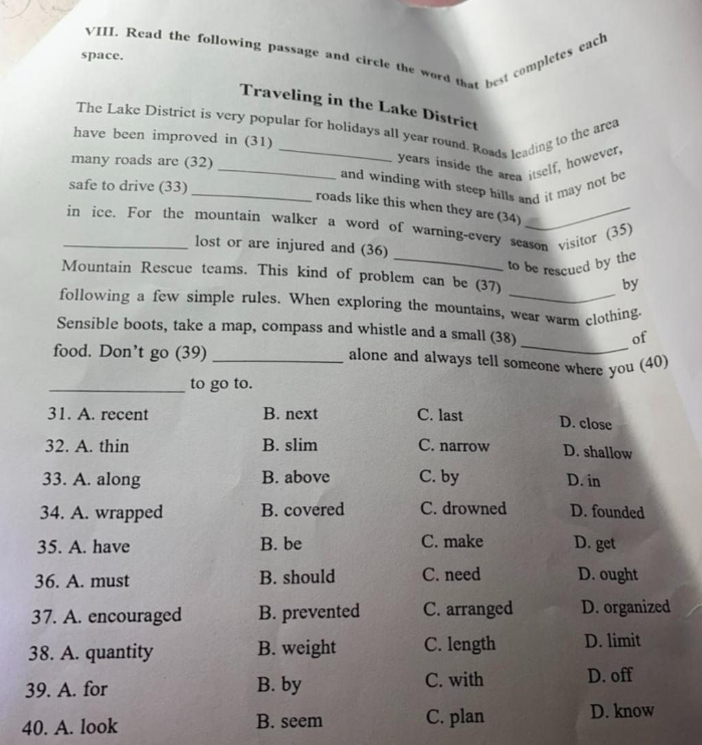 The Lake District is very popular for holidays all year round. Roads leading into the area have been improved in (31) ___________ years. Inside the area itself, however, many roads are (32) _____________ and winding with steep hills and it may not be safe to drive (33) ____________ roads like this when they are (34) _______________ in ice. For the mountain walker a word of warning – every season visitors (35) ______________ lost or are injured and (36) _____________ to be rescued by the Mountain Rescue teams. This kind of problem can be (37) __________________ by following a few simple rules. When exploring the mountains, wear warm clothing, sensible boots, take a map, compass and whistle and a small (38) _________________ of food. Don’t go (39) ______________ alone and always tell someone where you (40) __________ to go to.