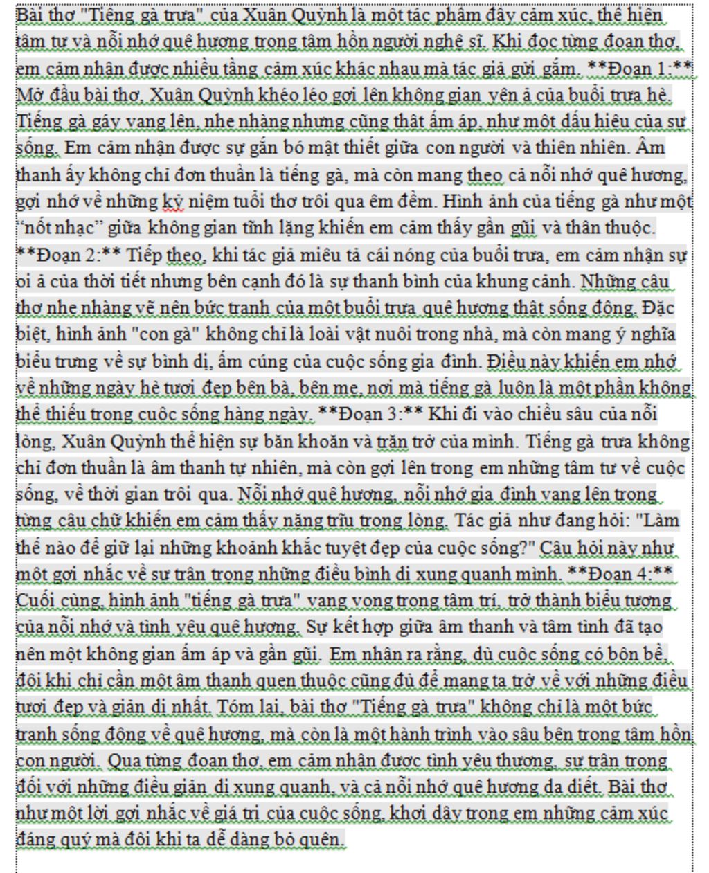 Bài thơ "Tiếng gà trưa" của Xuân Quỳnh là một tác phẩm đầy xúc động, gợi nhớ về những kỷ niệm tuổi thơ và tình yêu thương gia đình. Mỗi đoạn thơ đều chứa đựng những cảm xúc riêng, tạo nên một bức tranh đầy màu sắc và cảm xúc về quá khứ và hiện tại.