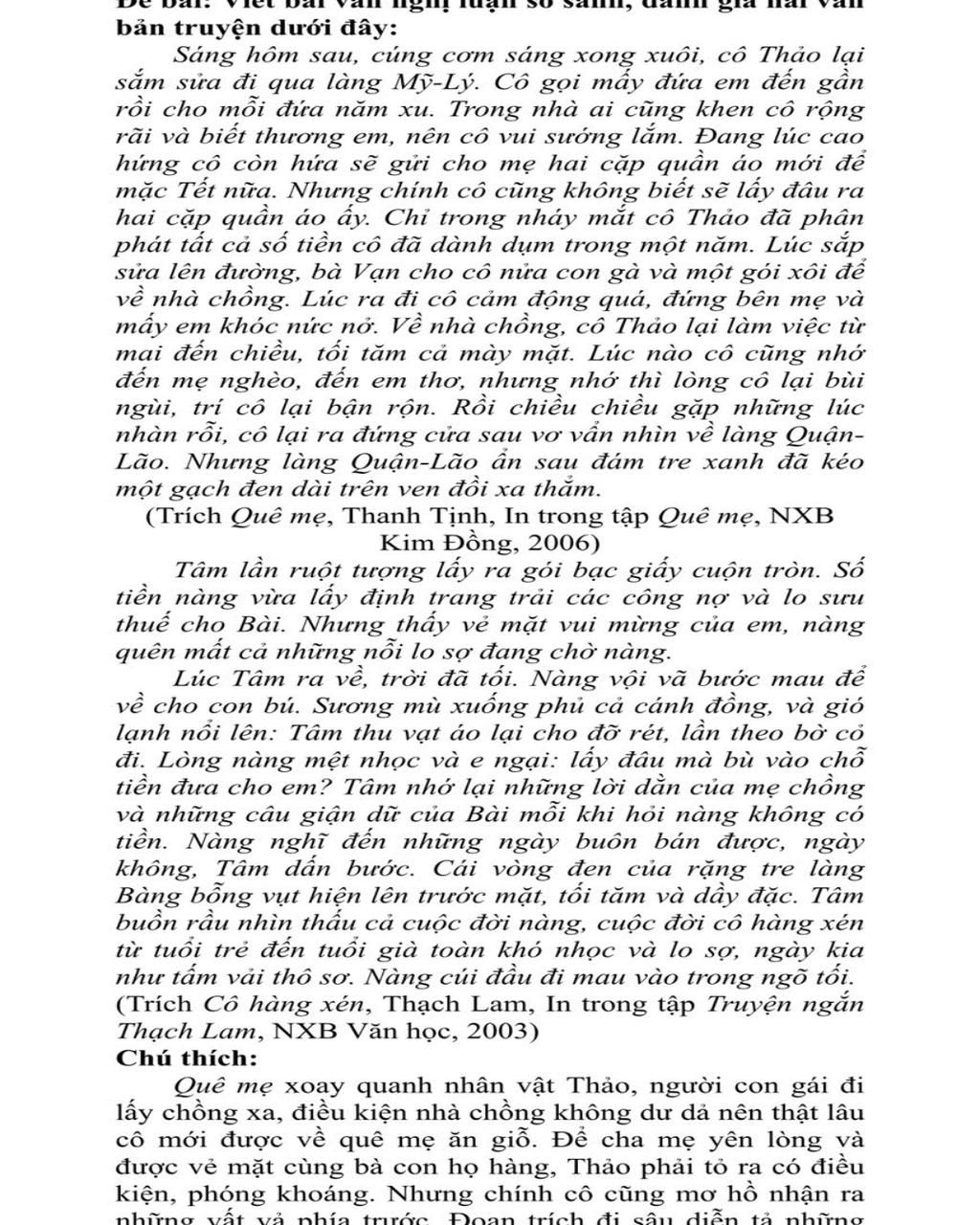 viết bài văn nghị luận so sánh, đánh giá 2 tác phẩm truyện trích quê mẹ của thanh tịnh và cô hàng xén của thạch lam