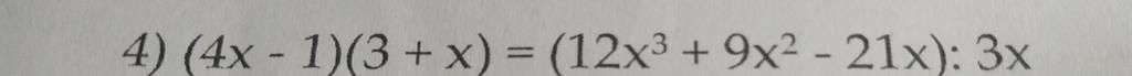 `4)` `(4x-1)(3+x)=(12x^3 +9x^2 -21x):3x`
