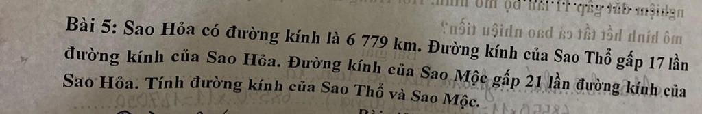 Sao hỏa có đường kính là 6779 kem. Đường kính của sao thổ gấp 17 lần đường kính của sao hoả.đường kính của sao mộc gấp 21 lần đường kính của sao hỏa.tính đường kính của sao thổ và sao mộc