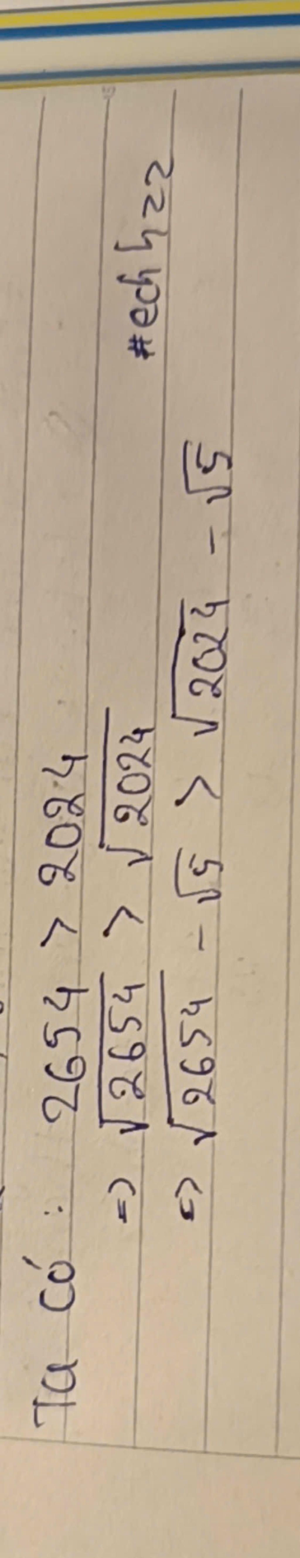 Cộng thêm vào 2 vế số `-sqrt{5}`, ta có: `sqrt{2625}-sqrt{5}>sqrt{2024}-sqrt{5}`