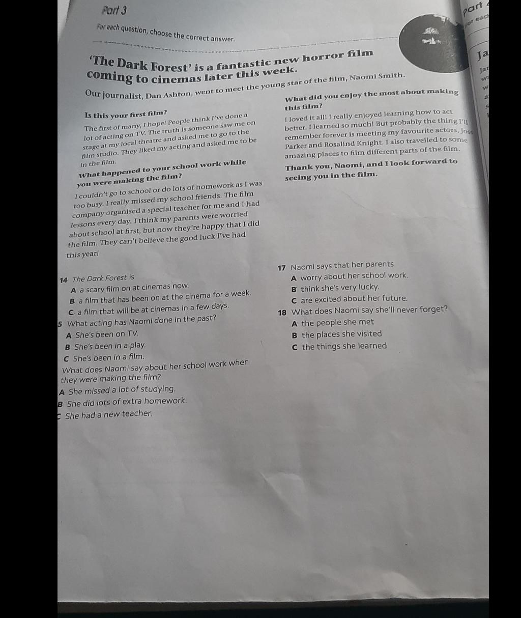 Mục "What happened to your school work while you were making the film?": I couldn't go to school or do lots of homework as I was too busy
