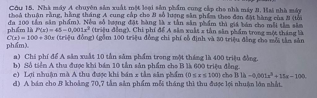 Câu 15. Nhà máy A chuyên sản xuất một loại sản phẩm cung cấp cho nhà máy B. Hai nhà máy