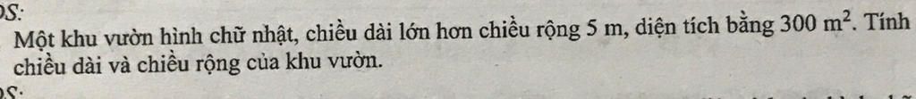 Vậy chiều dài của khu vườn là `20m`, chiều rộng là `15m`.