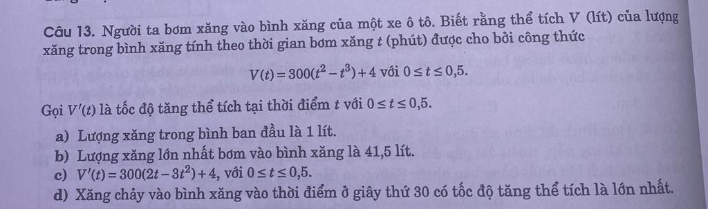 Câu 13. Người ta bơm xăng vào bình xăng của một xe ô tô. Biết rằng thể tích V (lít) của lượng