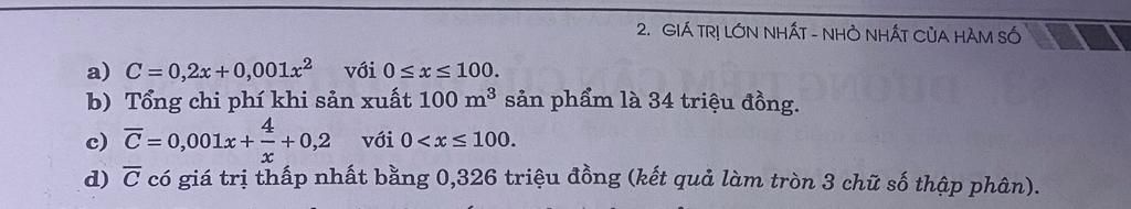 Tại một xí nghiệp chuyên sản xuất vật liệu xây dựng, nếu trong một ngày xí nghiệp sản xuất x (m³) sản phẩm thì phải bỏ ra các khoản chi phí bao gồm: 4 triệu đồng chi phí cố định; 0,2 triệu đồng chi phí cho mỗi mét khối sản phẩm và 0,001x^2 triệu đồng chi phí bảo dưỡng máy móc, Biết rằng, mỗi ngày xí nghiệp sản xuất được tối đa 100 m³ sản phẩm. Goi C(x) là tổng chi phí để xí nghiệp sản xuất x (m³) sản phẩm trong một ngày và C (gạch ngang) là chi phí trung bình trên mỗi mét khối sản phẩm