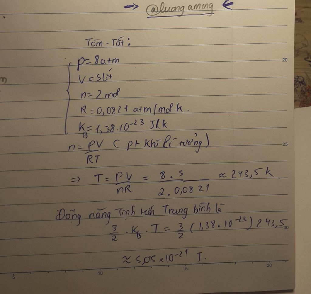 một khối khí 2 mol oxygen được đựng trong bình có thể tích 5l ở áp suất 8 atm tính động năng tịnh tiến trung bình