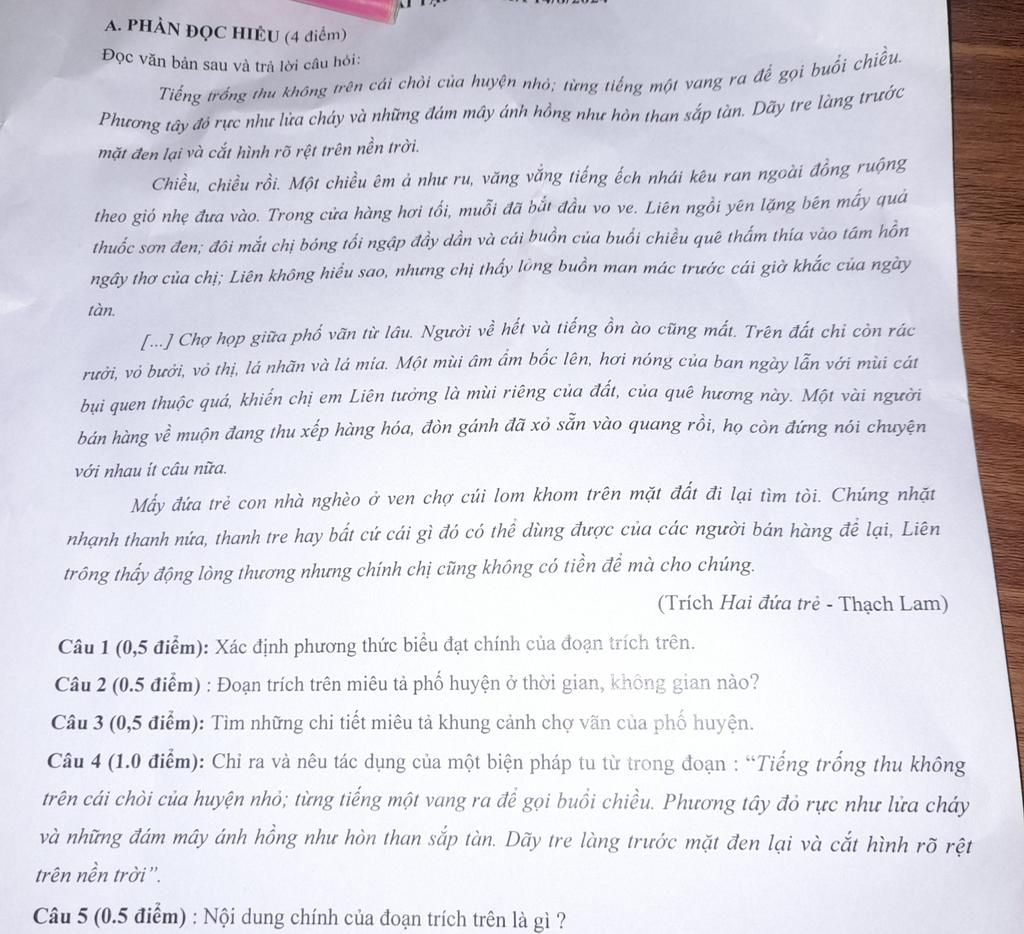 `->`Văn bản nói lên cuộc sống nơi phố huyện nghèo nàn và buổi chiều tà lúc phiên chợ đã tàn. Từ đó khắc họa lên những mảnh đời đói khổ, nghèo đói thời gian trước cách mạng tháng Tám. Đồng thời cũng là cái nhìn hướng đến những kiếp người nghèo khổ của nhà văn Thạch Lam.