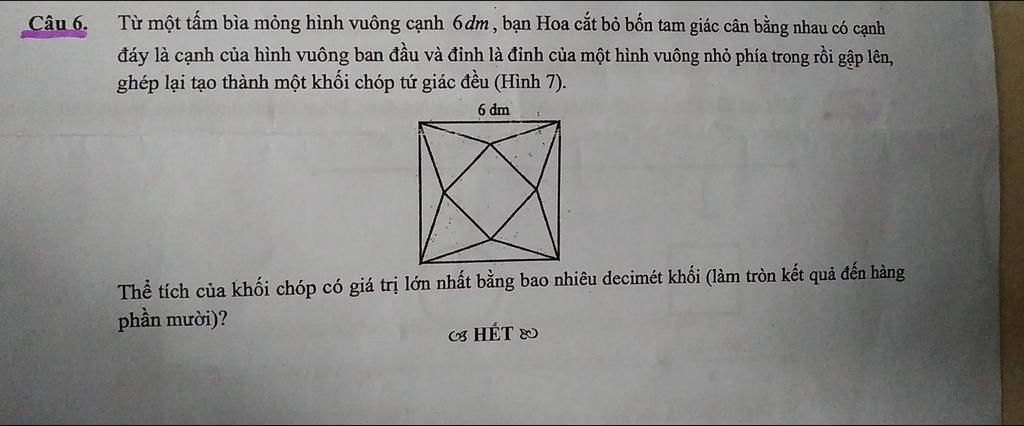 Câu 6. Từ một tấm bìa mỏng hình vuông cạnh 6dm, bạn Hoa cắt bỏ bốn tam giác cân bằng nhau có cạnh