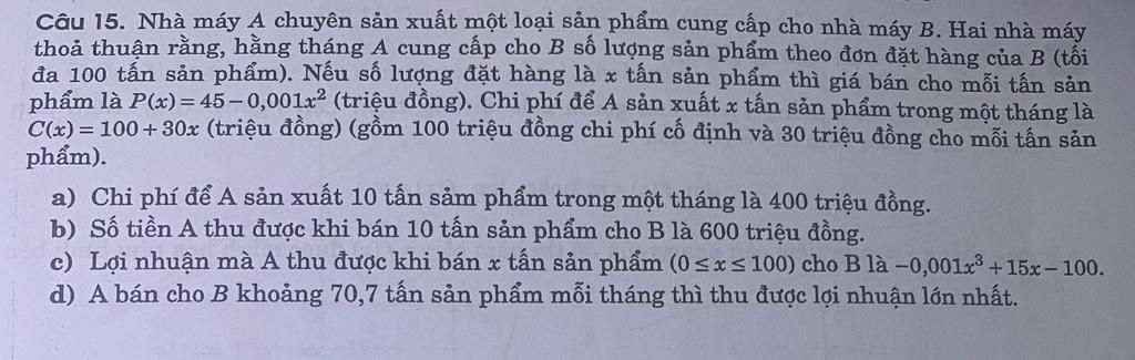 Câu 15. Nhà máy A chuyên sản xuất một loại sản phẩm cung cấp cho nhà máy B. Hai nhà máy
