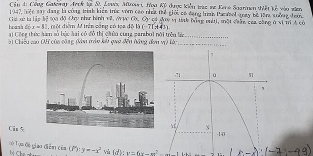 `a)` Công thức hàm số bậc hai có đồ thị chứa cung parabol nói trên là: `y=-143/5041x^2`