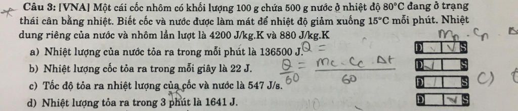 c) Nhiệt lượng cốc và nước tỏa ra trong mỗi giây là: