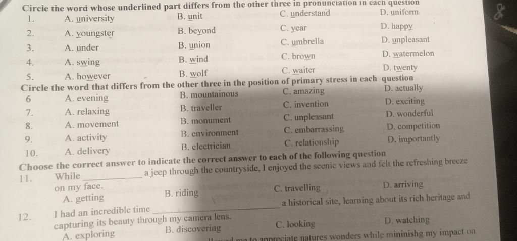 1- A. university (phát âm /juːˈnɪvɜːsəti/)