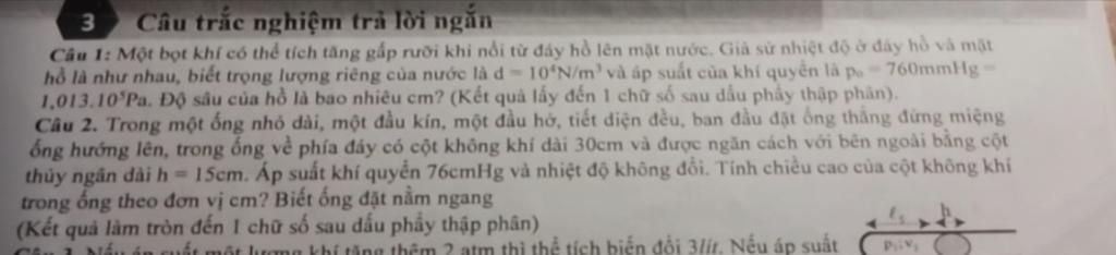 Câu 1: Một bọt khí có thể tích tăng gấp rưỡi khi nổi từ đáy hồ lên mặt nước. Giả sử nhiệt độ ở đáy hồ và mặt