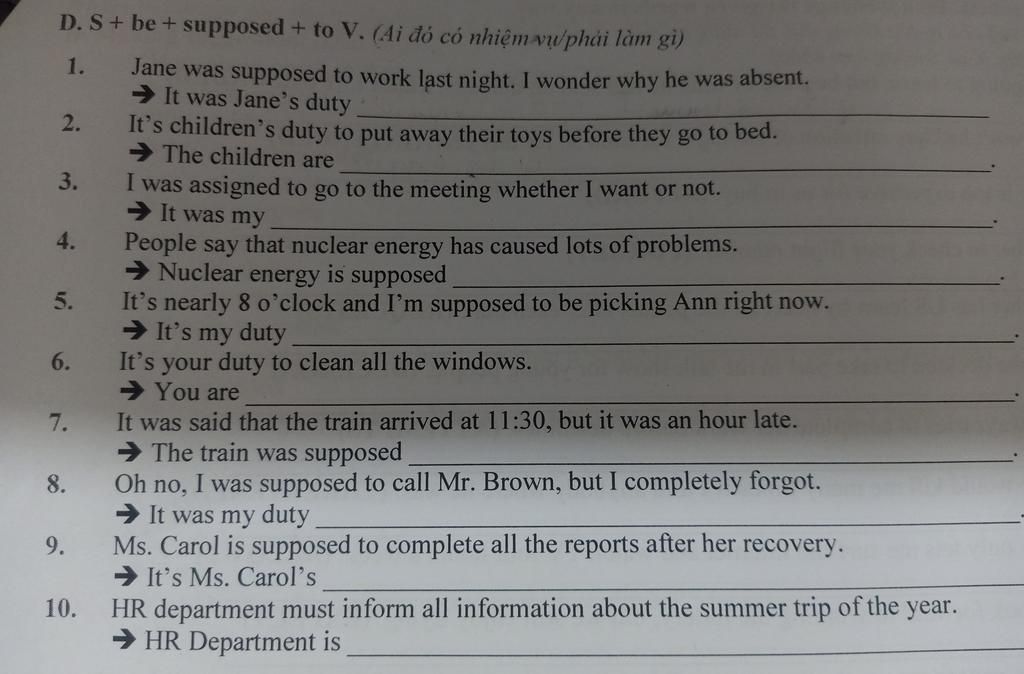 Các cấu trúc tương đương với "S + be + supposed to + V":+It's someone's duty to V: Đó là nhiệm vụ của ai đó để làm gì