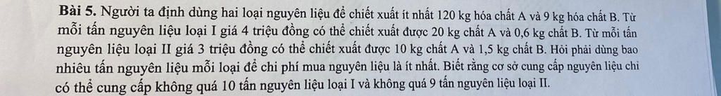 Vậy phải dùng `3,75` tấn nguyên liệu `I` và `4,5` tấn nguyên liệu `II` để chi phí mua nguyên liệu là ít nhất.