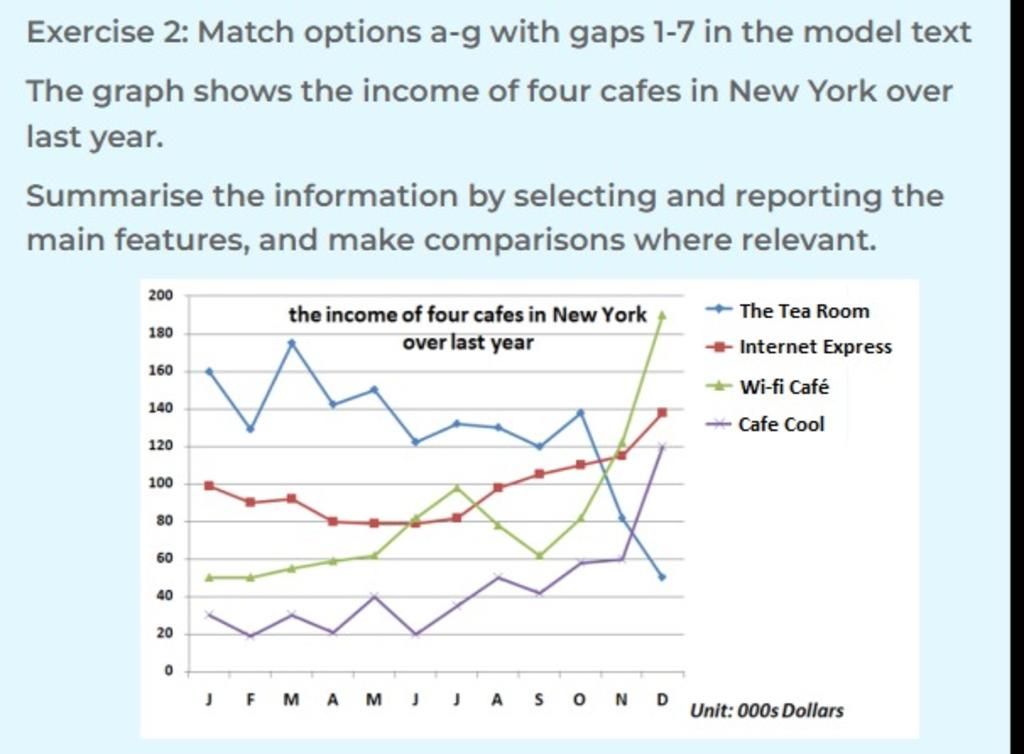 By contrast, the income for the other three cafes went up by varying degrees. There was 2. blank in Café Cool’s sales over the first ten months, followed by a sudden increase to $120,000. Furthermore, the income for both Internet Express and the Wi-fi Café 3. blank in December. The former experienced 4. blank to June, but after that, income rose