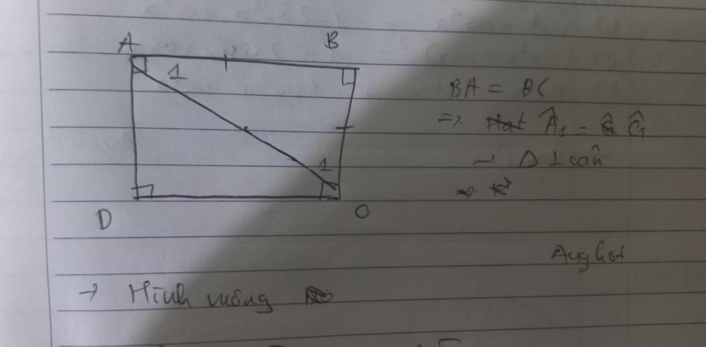Tứ giác có 2 cạnh kề bằng nhau và hai góc đối bằng 90 độ thì là hình gì ạ? Tứ giác ABCD có A và C vuông, BA=BC