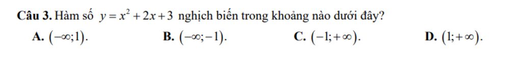 Hàm số y = $x^{2}$ + 2x + 3 nghịch biến trong khoảng nào dưới đây?