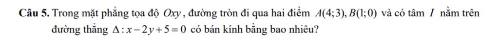 Gọi `I(x;y)` là tâm đường tròn. Vì `I` nằm trên đường thẳng `\Delta: x-2y+5=0` nên ta có: