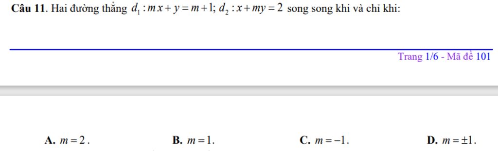 Ta xét: `m/1=1/m<=>m^{2}=(\pm1)^{2}<=>m\ne1(1)`