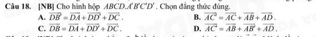 Mà `{(vec(DB)=vec(DA)+vec(DC)\ "(quy tắc hình bình hành)"),(vec(BB^')=vec(DD^')):}`