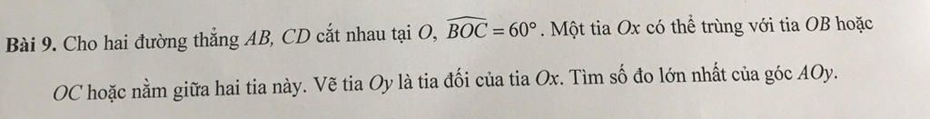 Bài 9. Cho hai đường thẳng AB, CD cắt nhau tại O, BOC =60° . Một tia Ox có thể trùng với tia OB hoặc