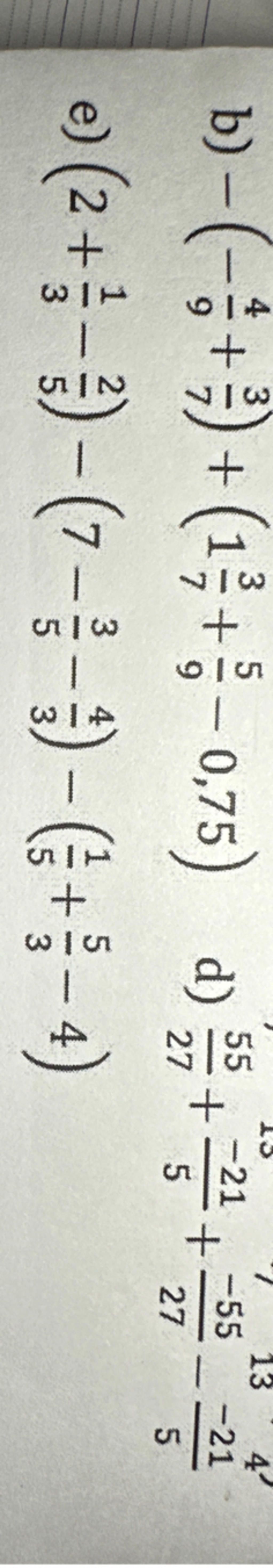 `b)-(-4/9+3/7)+(1 3/7+5/9-0,75)`