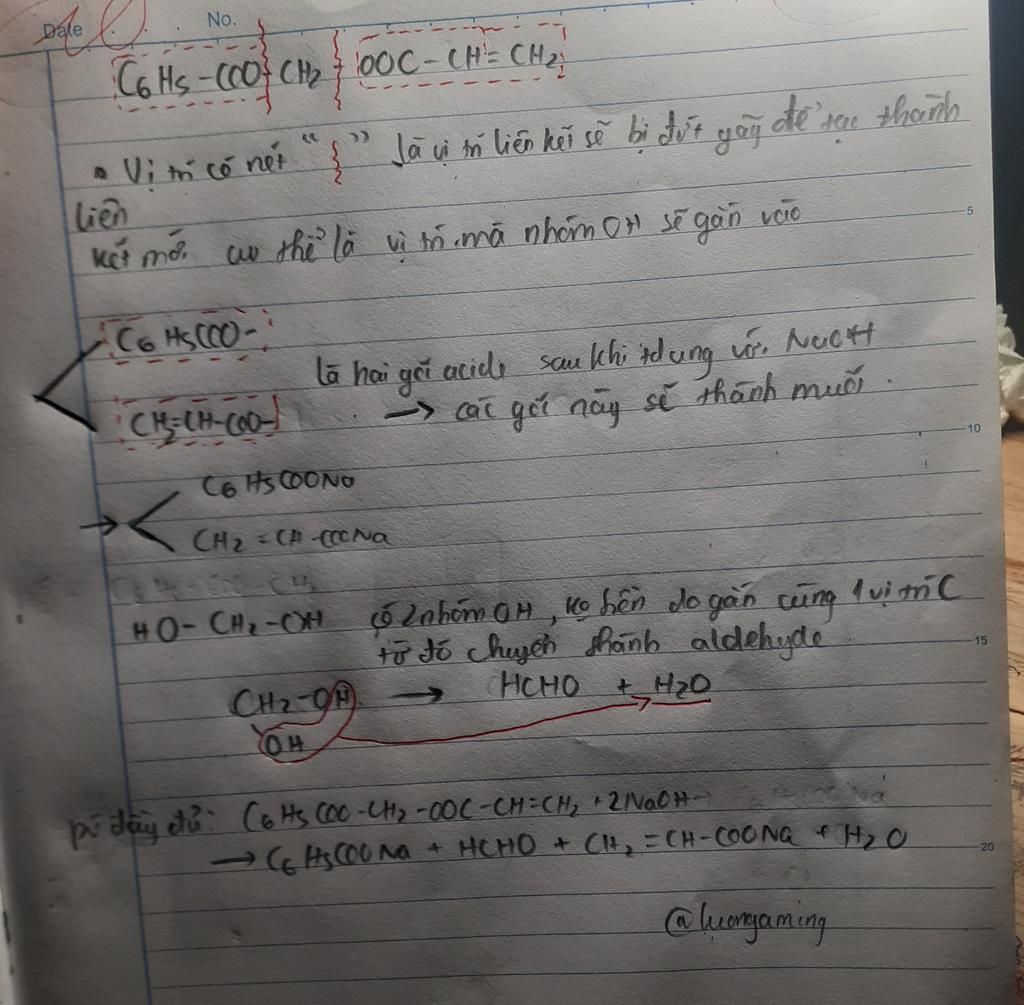 `C_6H_5COOCH_2OOC-CH=CH_2 +2NaOH\to C_6H_5COONa+CH_2=CHCOONa+HCHO+H_2O`