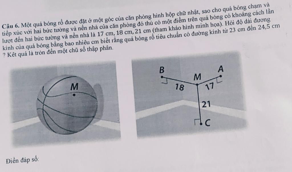 Câu 6. Một quả bóng rổ được đặt ở một góc của căn phòng hình hộp chữ nhật, sao cho quả bóng chạm và