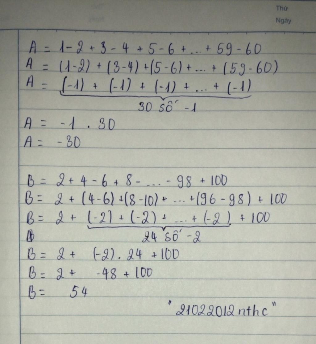 `A = (1 - 2) + (3 - 4) + (5 - 6) + ... + (59 - 60) (30 cặp)`