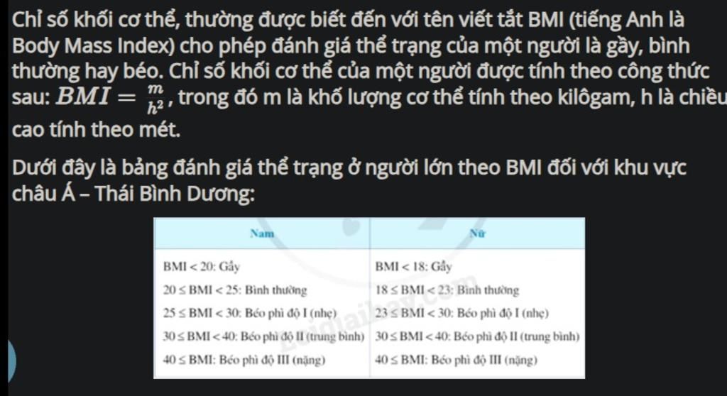 Bác Dũng có chiều cao 1,65 và cân nặng ít nhất là 82kg.Hỏi Bác Dũng có bị béo phì độ II hoặc độ III không?
